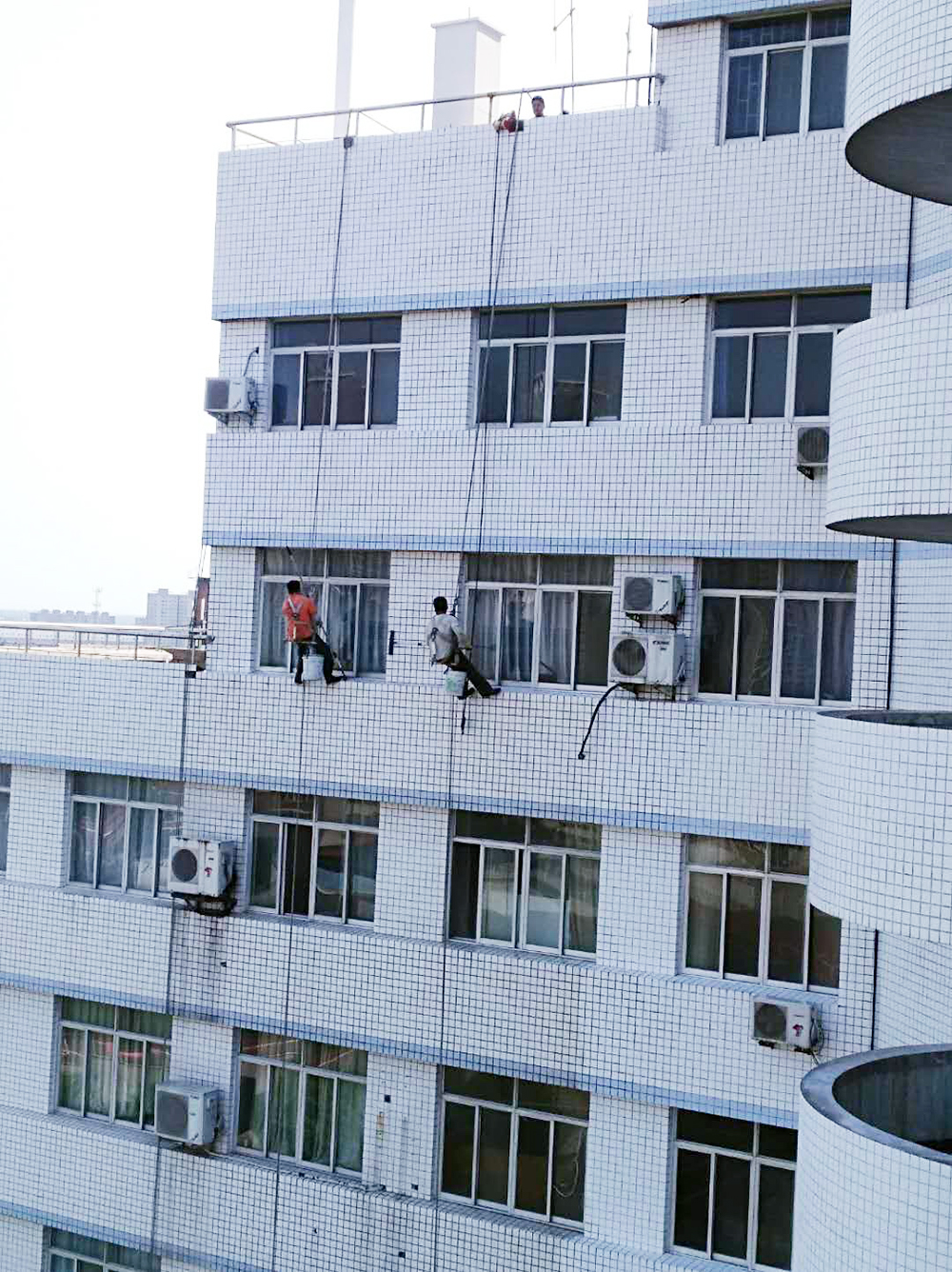 2)用浸有清潔劑溶液的清洗滾筒在外墻瓷磚、陶瓷錦磚裝飾材料表面用力來回滾動擦拭,使污垢潤濕、脫離。