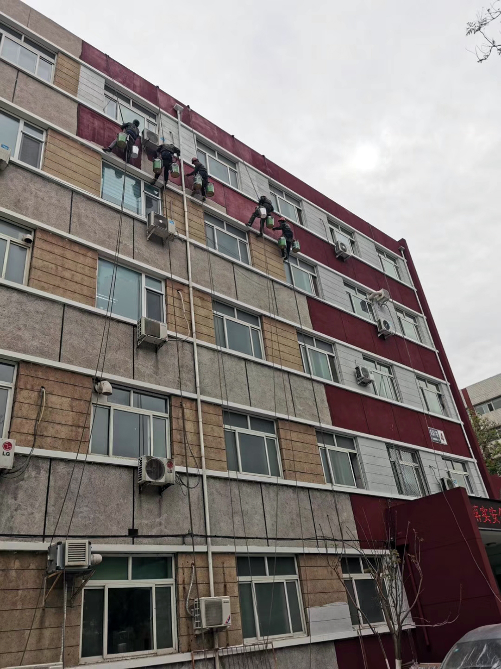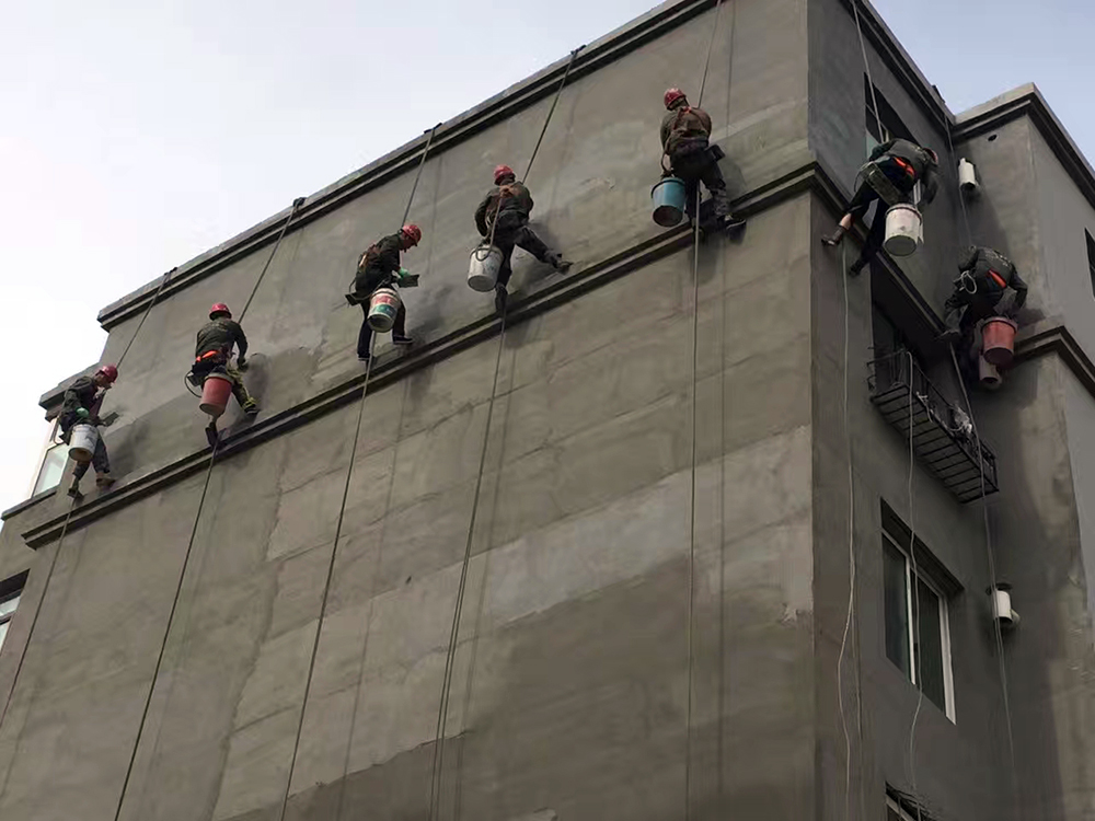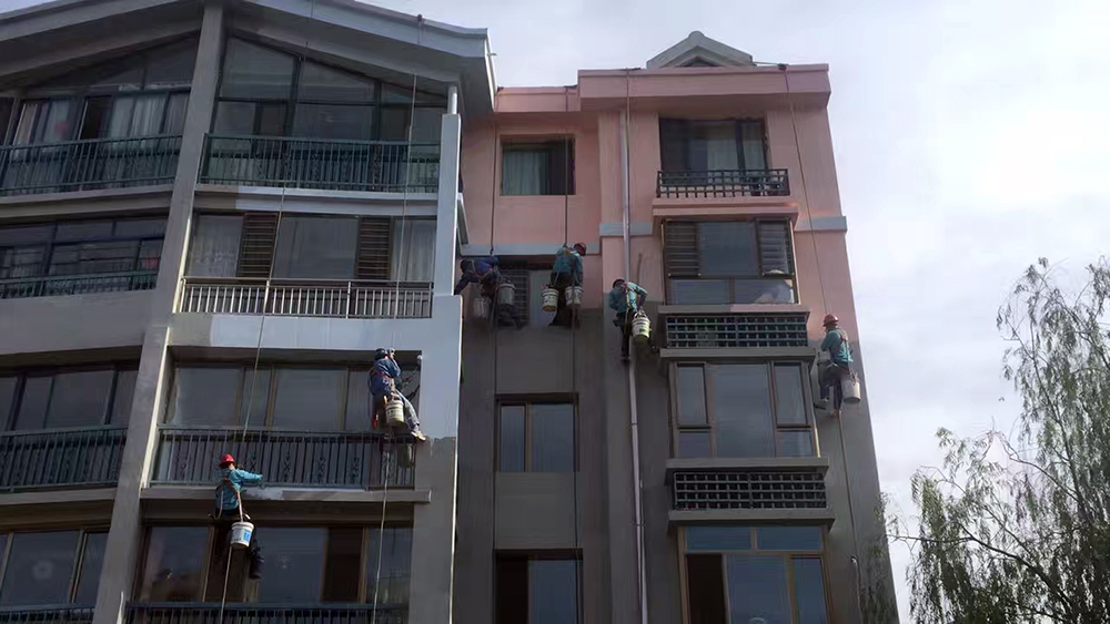 對要刷漆的外墻進行全面清理,鑿除多余的混凝土和雜物,并清理干凈腳手架上下及架底的垃圾。澆水沖洗墻面灰塵、濕潤墻面(墻面澆水深度10mm)隔天就澆水,刷漆前再補澆水濕潤,墻面要吃透水分,充分濕潤的墻面對前期的刷漆質量及刷漆后期的養護都有很大的作用;外墻先刮糙,刮糙前在不同基層處掛貼鋼絲網,包括窗邊刮糙,對混凝土面必須滿刮水泥素漿,刮糙厚度在5--8mm左右,外墻保溫砂漿必須要兩遍成活,否則不能保證保溫砂漿墻面的平整密實,刷漆一遍保溫砂漿,要壓平整密實,厚度7--9mm左右,預留好第二遍保溫砂漿的厚度,及時清理落地灰,并加以利用,第二遍保溫砂漿刷漆要必須保證墻面的平整密實,以保證抗裂砂漿的施工厚度,在保溫砂漿面拉通線貼分隔條,分隔條上下邊用水泥漿做成45°斜角護好分隔條,對墻面滲水也有保證,分隔條之間再拉通線做灰餅,以保證刷漆抗裂砂漿面的平整及厚度,檢查陰陽角及墻面平整度,發現不平整的地方及時修補平整;刷漆抗裂砂漿前對墻面進行充分澆水濕潤,刷漆抗裂砂漿要用鋁合金刮尺對準分隔條及灰餅刮平整,鋪貼裁好的網格布,壓進抗裂砂漿并搓平壓實,刷漆好的墻面必須要及時澆水養護,不然對墻面的刷漆質量造成很大的影響。